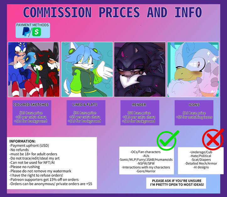 I have the right to decline any commissions I don't feel comfortable with. I haven't run into much issue with it but I will say what I can't or won't do. Thank you for understanding!